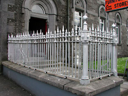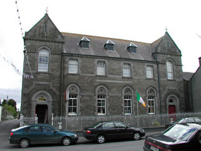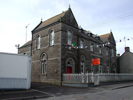 Detached six-bay two-storey former school, built in 1885, with gabled end bays, now used as a shop. Pitched slate roof with vents, terracotta ridge cresting and cast-iron finials. Snecked rock-faced stone walls with platbands, plaque, eaves course and tooled quoins. Ashlar and decorative stone surrounds to window openings with timber sash windows. Timber panelled double doors set in stone doorcases with overlights. Two two-storey returns. Cast-iron railings and gates to front.