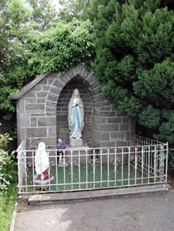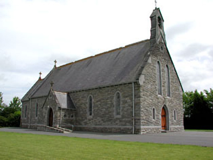 Detached gable-fronted church, built c.1880. Comprising of four-bay side elevations to nave with porch attached, having single-bay chancel to north-east with sacristy attached. Pitched slate roof with decorative ridge cresting, and bellcote to south-west gable. Snecked rock-faced limestone walls with ashlar dressings. Stained glass windows set in pointed-arched openings with ashlar limestone dressings. Timber battened double doors with strap hinges set in pointed arched opening having ashlar dressings. Grotto bounded by cast-iron railings to south. Concrete boundary walls and cast-iron railings with carved limestone gate piers and cast-iron gates.