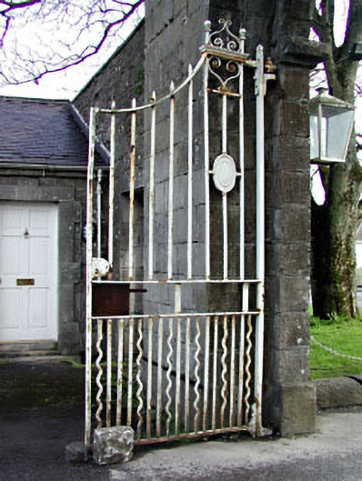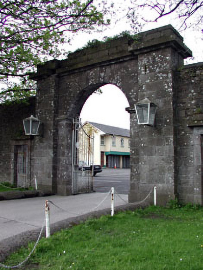 Squared rubble limestone boundary walls, built c.1835, with ashlar coping. Accessed through round-headed arch with flanking piers having cornice above. Flanked by pedestrian gates with ashlar limestone surrounds. Double and single cast- and wrought-iron gates to openings. Theses entrances are protected by gun loops in a flanking wall.