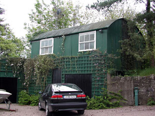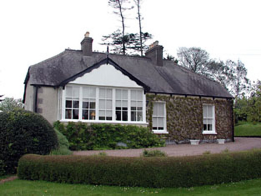 Detached three-bay single-storey house, built c.1880, with gabled and glazed projecting entrance bay. Roughcast rendered walls with cement rendered quoins. Half-hipped slate roof with cast-iron ridge cresting, eaves dentils and cement rendered chimneystacks. Square-headed openings with timber two-over-two sash windows. Corrugated-iron outbuildings to rear.