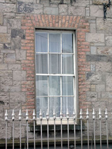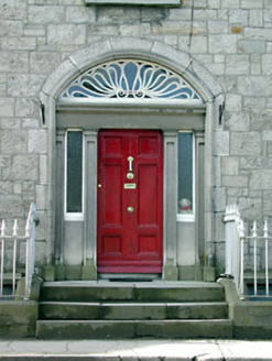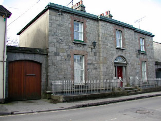 Detached three-bay two-storey over basement house, built c.1835, with breakfront central bay. Snecked stone walls with limestone plinth and lead covered parapet. Segmental-arched stone doorcase, with timber panelled door, sidelights and decorative fanlight. Timber six-over-six sash windows with stone sills. Carriage arch to the east of house. Cast-iron spear-headed railings on limestone plinths to front.