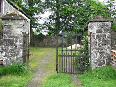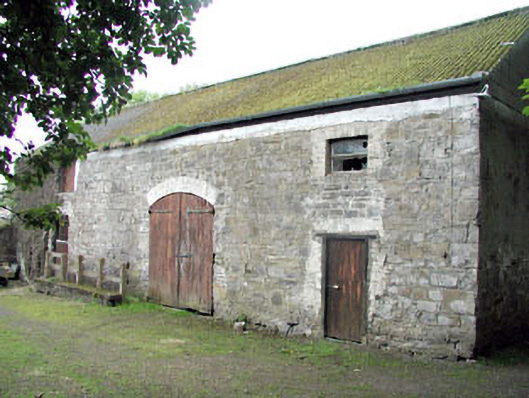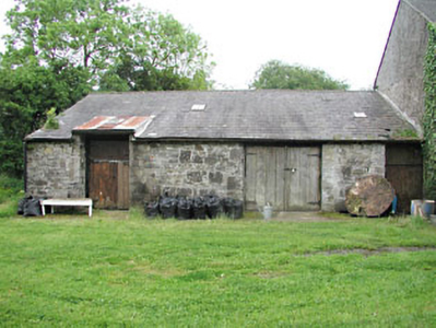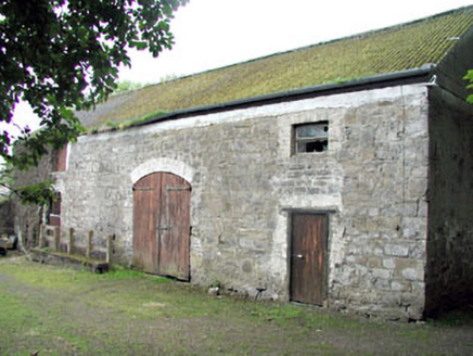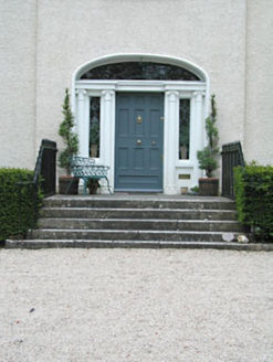 Detached three-bay two-storey house over semi-basement, built c.1800, with central breakfront, and flanking single-storey wings. Hipped slate roof with rendered chimneystack. Roughcast rendered walls. Timber sash windows with stone sills. Segmental-arched doorcase with pairs of engaged Ionic columns flanking timber panelled door, with fanlight and side lights. Stone steps with cast-iron railings. Three-bay two-storey rubble limestone former coach house and cast-iron gates to the site.