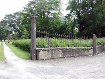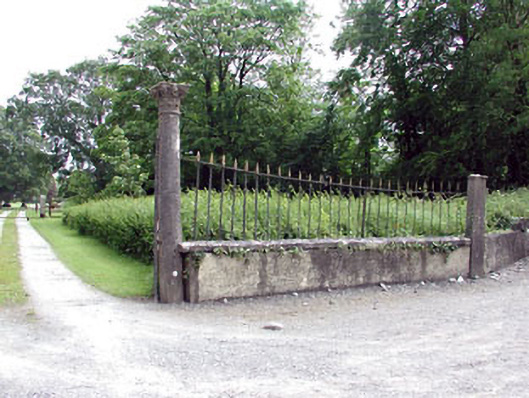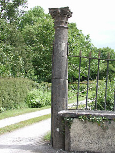 Carved limestone gate piers, erected c.1750. Comprising of pair of Corinthian columns supporting pair of cast-iron gates, flanked by cast-iron railings set on plinths. Second set of limestone gate piers to east. Gate lodge, now in ruins, to the site.