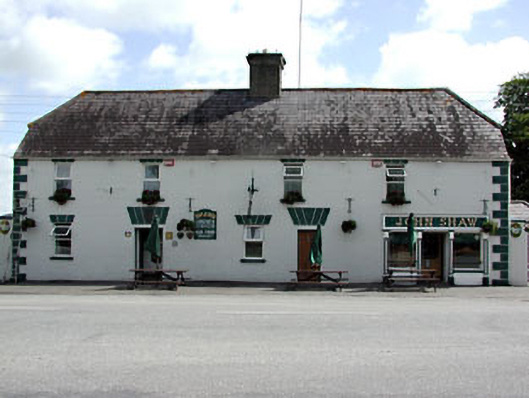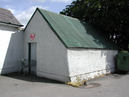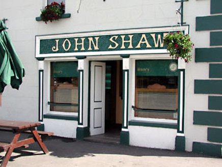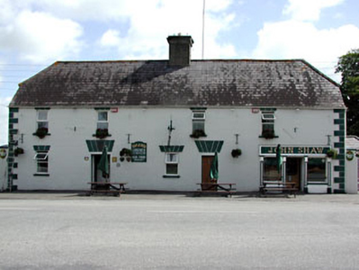 Detached five-bay two-storey house, built c.1860, now also in use as public house. Hipped slate roof with central rendered chimneystack. Rendered walls with render quoins. Render shopfront with pilasters flanking openings supporting fascia. Timber panelled double doors. Render dressings over openings. Stone outbuildings with pitched corrugated-iron roofs to rear.