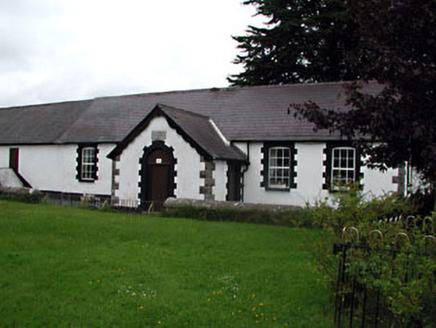 Detached four-bay single-storey former national school, built in 1887, with gabled porch, now in use as a parish hall. Pitched slate roofs with carved timber bargeboards. Rendered walls with rock-faced quoins and limestone date plaque. Segmental-arched window openings with brick dressings and stone sills. Round-arched door opening with brick dressings. Extension to west gable.