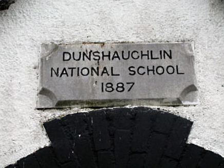 The modest form and scale of this former school is enhanced by interesting architectural details, such as the gabled breakfront and segmental-arched openings. The rock-faced quoins and brick dressings articulate the form of the building. The building retains many interesting features and materials, such as the carved timber bargeboards and slate roofs. Plaque above door reads: 'Dunshaughlin National School 1887'.