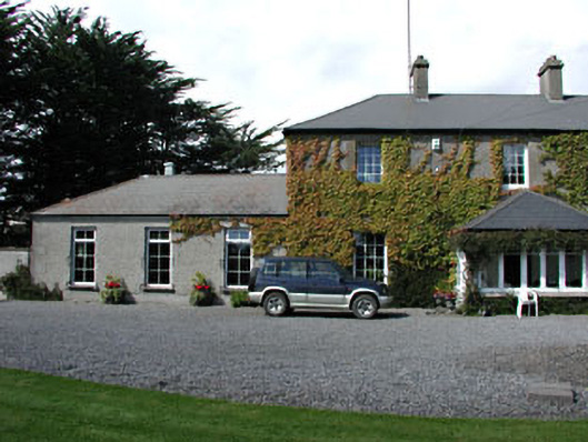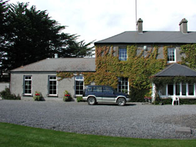 Detached three-bay two-storey house, built c.1800. Hipped artificial slate roof with rendered chimneystacks. Roughcast rendered walls. Tooled limestone block-and-start surrounds and sills to window openings. Round-arched door opening with tooled stone block-and-start surround and a spoked fanlight. Modern central porch addition, and three-bay single-storey extension to west. Pair of cast-iron gates to site.