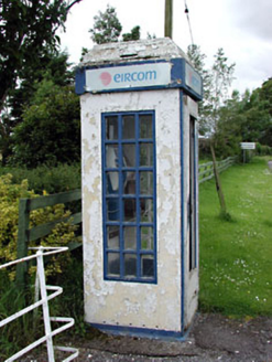 Concrete telephone box, erected c.1950, with moulded concrete cap, glazed panels and glazed door.