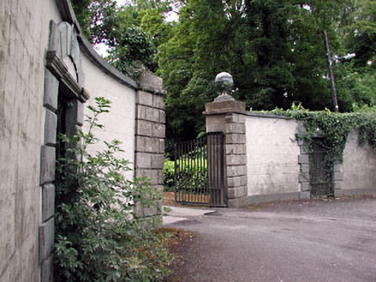 Entrance to Dunboyne Castle, built c.1764, comprising channelled ashlar gate piers surmounted by ball finials with Greek key motifs. Set in rendered curved walls having inset square-headed pedestrian entrances. Rendered quoins, cornices and segmental-arched voussoirs to pedestrian entrances. Replacement single and pair of gates.