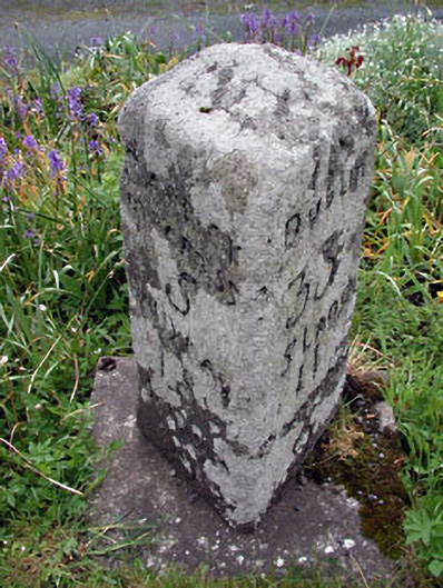 Triangular-profile granite milestone, c.1780, inscribed on two sides.