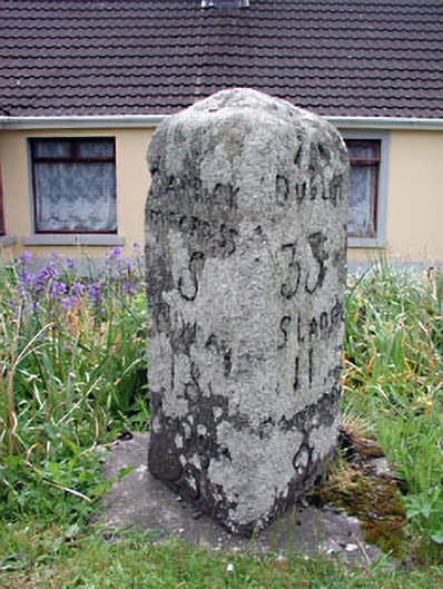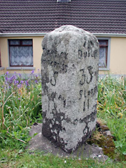 This milestone is a reminder of the great coaching era in Ireland when the post office operated a coach based system of postal distribution. The simple form and carving of the structure is similar to other such milestones which are found in Meath, dating to the same period. The west face reads: "CARRICK MACROSS 5 BALLYBAY 15 Monaghan 25" while the east face reads: "Dublin 33 Slane 11 Drumcondra 2". The top is inscribed: "CM".