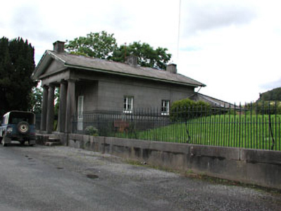 Detached gable-fronted gate lodge with recessed flanking bay, built c.1780, with carved limestone Doric portico, set on a raised plinth. Pitched and hipped slate roofs with ashlar limestone chimneys. Ashlar limestone walls, channelled to lower level with string course above. Paired timber glazed doors and timber sash windows. Ashlar limestone steps to site, with flanking plinth walls having cast-iron railings.