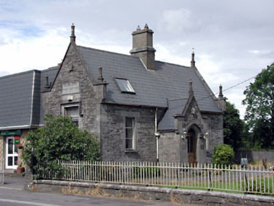Detached three-bay single-storey post office, built c.1840, with gabled porch. Pitched artificial slate roof with carved pinnacles and rendered chimneystack. Dressed limestone walls with ashlar quoins and plaque. Tooled limestone dressings to window openings. Pointed arch door opening with hood moulding above to porch. Entrance to west gable now in use as window. Extension to the rear. Cast-iron railings set on limestone plinths, with dressed limestone gates piers and cast-iron double gates.