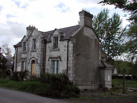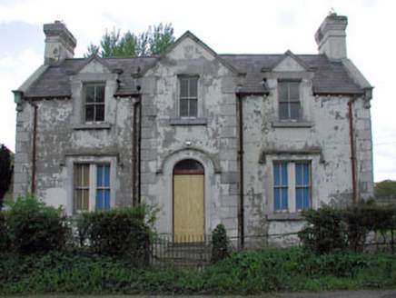 Detached three-bay single-storey worker's house with half-dormer attic, c.1870, on a symmetrical plan centred on single-bay full-height gabled breakfront. Now disused. Pitched slate roof including gablets to window openings to half-dormer attic centred on pitched (gabled) slate roof (breakfront), clay ridge tiles, "Cavetto" coping to gables on cut-limestone kneelers with rendered chimney stacks to apexes having stringcourses below corbelled stepped capping supporting terracotta pots, and cast-iron rainwater goods on ogee or thumbnail beaded consoles retaining cast-iron downpipes. Rendered, ruled and lined walls on rendered plinth with rendered quoins to corners. Segmental-headed central door opening with two steps, cut-limestone block-and-start surround having chamfered reveals with hood moulding framing boarded-up door having overlight. Square-headed flanking window openings in bipartite arrangement with cut-limestone sills, timber mullions, and cut-limestone block-and-start surrounds having chamfered reveals with hood mouldings framing two-over-two timber sash windows. Square-headed window openings (half-dormer attic) with cut-limestone sills, and cut-limestone block-and-start surrounds having chamfered reveals framing two-over-two timber sash windows. Set back from line of road with wrought iron "estate railings" to perimeter.