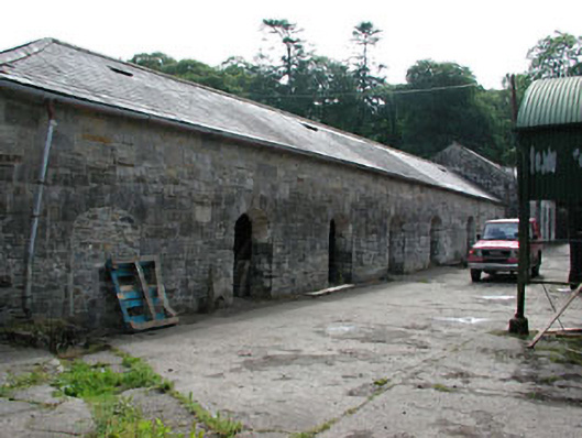 Farmyard complex, built c.1780, comprising of four ranges of single- and two-storey outbuildings set around a central courtyard, with detached outbuildings set within the courtyard. Pitched slate roofs, with gabled central bays to north-western and south-western ranges, and with bellcote to north-eastern range. Dressed stone walls with ashlar limestone dressings to segmental-arched and square-headed openings. Remains of walled gardens and outbuildings to site.