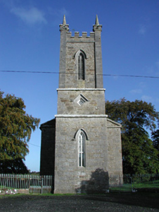Detached former Church of Ireland church, built c.1820, with three-bay nave, three-stage tower to south and vestry to north. Situated within its own grounds. Church is no longer in use. Pitched slate roof with terracotta ridge tiles and chimneystack over northern gable. Random coursed stone walls with tooled stone plinth course. String courses to tower with pinnacles and crenellations. Crenellations to parapet of vestry. Pointed-arched window openings to nave with Y-tracery and diamond-paned glazing bars. Diamond-shaped window openings with hoodmouldings to central stage of tower. Pointed-arched louvred openings to belfry with hoodmouldings. Square-headed window opening to vestry with tooled stone surround, hoodmoulding and diamond-paned windows. Pointed-segmental chancel window with Y-tracery. Pointed-arched door opening to tower with tooled stone surround, hoodmoulding, timber blind tracery panelled double doors and stone threshold. Pointed-arched door opening to vestry with timber battened door. Church set within graveyard with variety of stone grave markers. Enclosed private burial plot to west of church, bounded by random coursed stone wall with tooled coping and accessed though flat-arched portal opening with wrought-iron gate. Tower of church is flanked by sweeping wrought-iron railings set on a tooled stone plinth with gates, which bound graveyard to south.