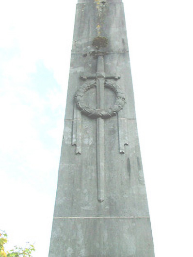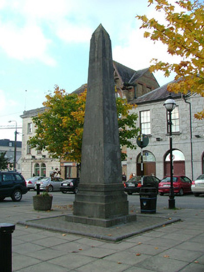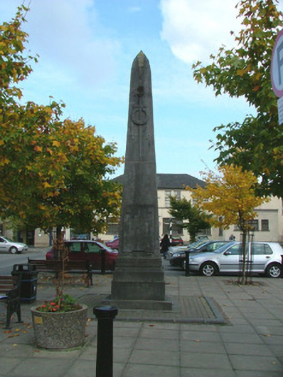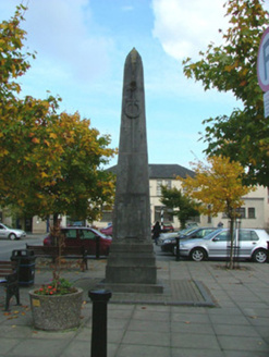 Freestanding cut-limestone obelisk, unveiled 1926, on a square plan on pedestal on cut-limestone plinth. Set in concrete flagged island in square with cut-limestone chamfered kerbing to perimeter framing concrete brick setts.