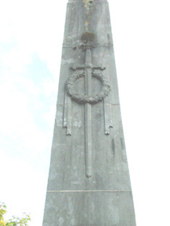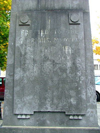 A memorial signed by Francis William Doyle Jones RBS (1873-1938) commemorating 'THE MEN OF OFFALY (KING'S COUNTY) WHO GAVE THEIR LIVES IN THE GREAT WARS: the memorial originally commemorated only those lost during the First World War (1914-8) but was later amended, an additional "S" after "WAR" not quite matching the original typescript, to commemorate those lost during the Second World War (1939-45). The blue-grey Ballyduff limestone for the memorial was supplied by Molloy's Quarries of Tullamore and, austerely detailed, features a long sword, its blade pointed down symbolising sacrifice, piercing a ribboned laurel wreath symbolising victory.