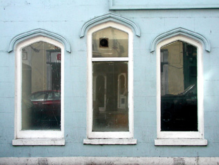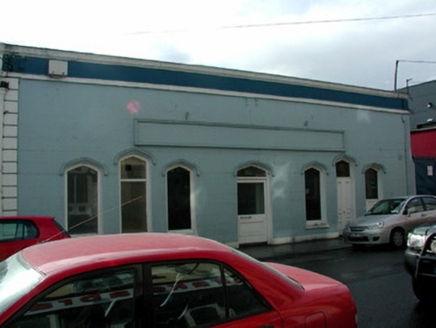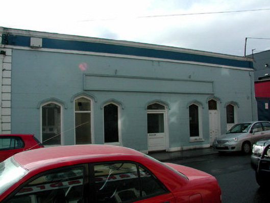 End-of-terrace seven-bay single-storey former hall, built c.1860, now in use by adjacent public house. Fronts directly onto street. Pitched corrugated-iron roof hidden by parapet to front. Ruled-and-lined render to front elevation with quoins to east corner, cornice and plat band to parapet and fascia. Tudor arched window openings, grouped in three with rendered hoodmouldings and stone sills. Central window to west has been converted for use as a doorway with timber panelled door and overlight inserted. Centrally placed Tudor arched door opening with replacement glazed timber door with overlight and hoodmoulding.