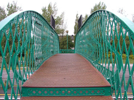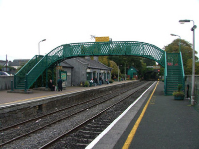Single-arch metal girder footbridge, c.1890, spanning the Dublin to Galway railway line. Erected by the Great Southern and Western Railway Company. Relocated here from the Roscrea station in County Tipperary. Metal staircase leading up to bridge. Bridge supported on four cast-iron columns with foundry mark: 'E Manisty Dundalk'.