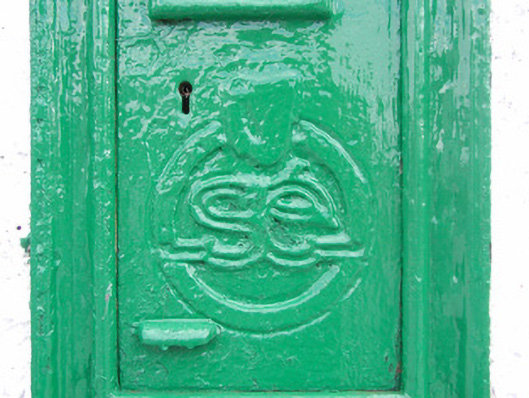 Wall-mounted cast-iron post box, c.1925, with S É insignia encircled and crowned with harp motif. Set in roughcast rendered wall abutting façade of garda station in the village of Clonbulloge. Maker's mark to base 'W.T. Allen & Co. London'.