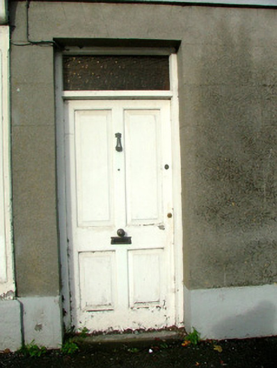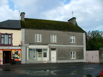 End-of-terrace three-bay two-storey house, built c.1880, with shopfront to ground floor. Fronts directly onto street. Pitched tiled roof with terracotta ridge tiles, rendered chimneystacks and cast-iron rainwater goods. Ruled-and-lined render to ground floor with roughcast render to first floor, smooth render plinth, quoins and string course. Timber casement windows with painted sills. Square-headed door opening having timber panelled door with overlight. Shopfront comprises large display windows, glazed timber door with overlight. Shopfront flanked by fluted pilasters with console brackets, timber fascia and cornice. Stone outbuilding with corrugated roof to north. Site to north bounded by random coursed rubble wall and accessed through corrugated-iron gate.