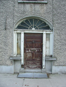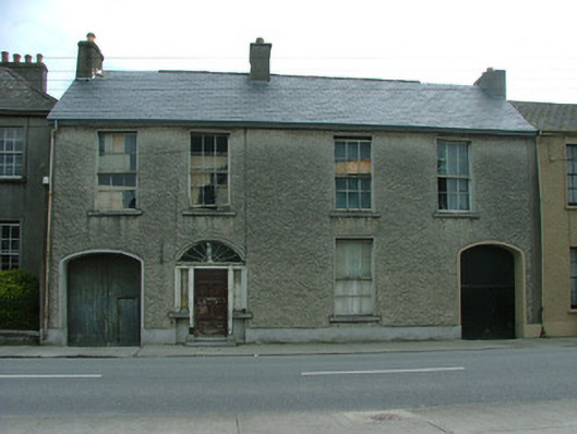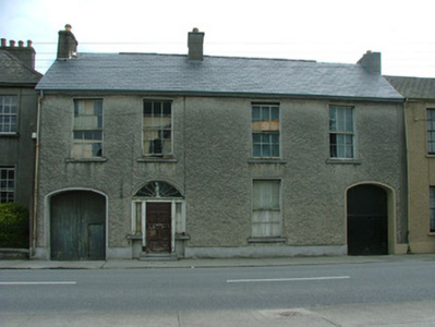Terraced four-bay two-storey house, built c.1820, with two integral carriage arches and extension to rear. Possibley originally two two-bay two-storey houses. Now derelict. House fronts directly onto street. Pitched modern slate roof with rendered chimneystacks, terracotta pots and cast-iron rainwater goods. Roughcast render to walls. Timber sash windows with stone sills. Segmental-headed door opening with flat-panelled pilasters flanking sidelights and timber panelled door, surmounted by fanlight. Tooled limestone steps give access to doorway. Segmental-headed integral carriage arches with moulded surrounds and timber battened double doors.