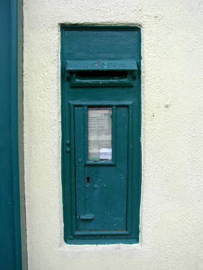 Wall-mounted cast-iron post box, erected c.1900. The words 'Post Office' are in raised lettering above the letter slot. Manufacturer's name 'W.T. Allen & Co. London' to base.