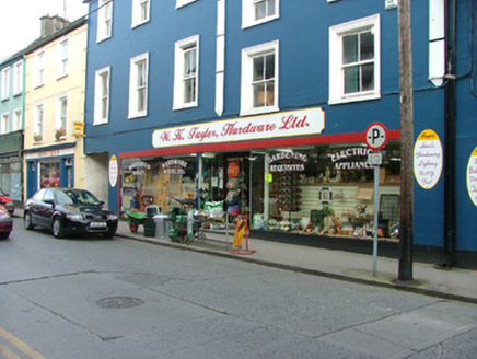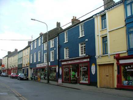 Terraced seven-bay two and three-storey house, built c.1900, formerly three separate houses. Shopfronts to ground floor. Buildings front directly onto street. Pitched slate roofs with rendered and red brick chimneystacks and terracotta pots. Replacement rainwater goods. Ruled-and-lined render to walls with smooth render to ground floor and stucco quoins. Timber casement windows to first floor with timber sash and stone sills to second floor. Timber shopfront to south comprising central recessed timber and glazed door, flanked by large display windows with timber pilasters and fascia. Modern glazed shopfront to centre. Square-headed integral carriage arch.
