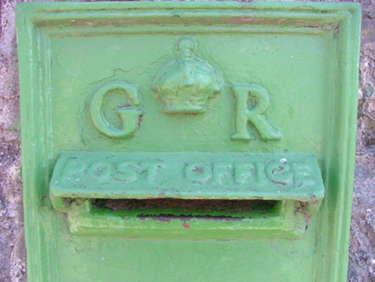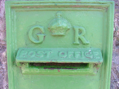 Cast-iron post box, erected c.1915, set within random coursed rubble wall. Raised cast-iron lettering with crown motif and GR royal cipher. Raised lettering at base with manufacturer's mark 'W.T. Allen & Co. London'.