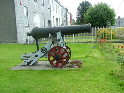 John's Hall, reminiscent of an Ionic temple, stands on John's Place to which it gave its name. The fine, beautifully designed edifice has an interesting history, fitting for such a spectacular building. It was designed, c.1828, by Bernard Mullins and who asscribed the inspiration to be the Temple of Ilissus. Mullins was also responsible for Saint Brendan's Catholic Church and Tullanisk. John's Hall was completed in 1833 by the Second Earl of Rosse, to commemorate the death of his twenty-six year old year old son, John Clere Parsons, who died of scarlet fever. It was first used as a school house and later it once housed Birr's Heritage Centre. With its striking Ionic portico, the building exhibits many architectural features which mark it out as one of the finest structures within Birr. Adjacent to John's Hall is a cannon known as the Crimean Gun. Captured from the Russians at the siege of Sevastopol in 1855 during the Crimean War, it was presented to the people of Birr in 1858. Its architectural setting is further emphasised by the row of houses standing directly behind on John's Place.