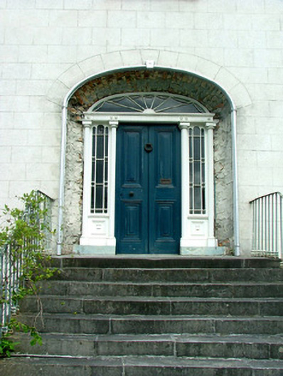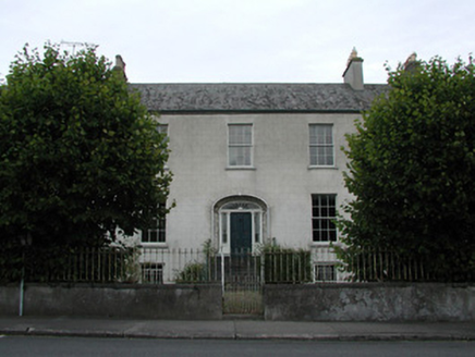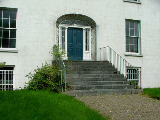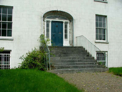 Terraced four-bay two-storey house over raised basement, built c.1820, with integral carriage arch. Now disused. Set back from the road. Pitched slate roof with rendered chimneystacks, terracotta pots and terracotta ridge tiles. Cast-iron rainwater goods. Ruled-and-lined render to facade. Timber sash windows with stone sills, cast-iron bars to basement windows. Round-headed window opening to rear elevation with sash window and intersecting glazing bars. Segmental-headed door opening with coved rendered surround and spider web fanlight. Timber doorcase comprising engaged fluted Doric columns surmounted by cornice and flanking timber panelled door with sidelights. Limestone steps to doorway with wrought-iron handrail. Segmental-headed carriage arch with timber battened doors. Tooled limestone wheel guards to entrance. Site bounded by rendered plinth wall surmounted by cast-iron railings having fleur-de-lis finials and cast iron gates.