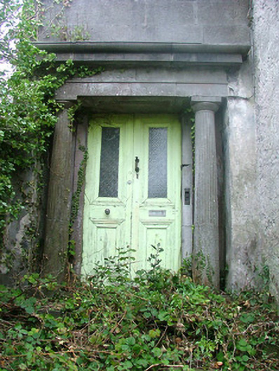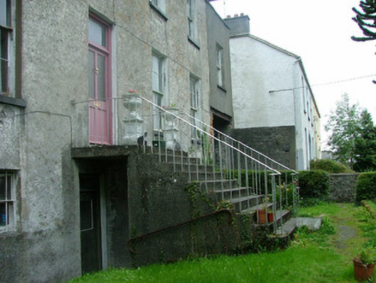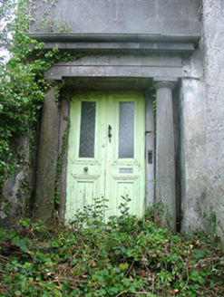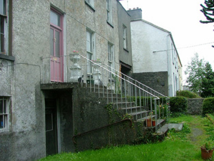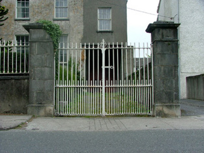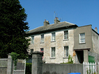 Detached five-bay two-storey house over raised basement, built c.1800, with flat-roofed single-bay single-storey extension above integral carriage arch to east and flat-roofed entrance bay to west. Set back from the road. Hipped slate roof with paired timber brackets, rendered chimneystacks, terracotta pots and cast-iron rainwater goods. Roughcast rendered walls. Ashlar to western extension. Timber sash windows with tooled stone sills, cast-iron bars to basement windows. Square-headed central door opening with replacement timber and glazed door with overlight, accessed by limestone steps with flanking cast-iron railings. Western extension with square-headed opening, tooled limestone doorcase with fluted Doric columns and moulded cornice, glazed and panelled timber door, accessed by steps. Square-headed door opening to basement with glazed timber door. Square-headed integral carriage arch to east with double timber battened doors. Ruled-and-lined rendered boundary wall to front with wrought- and cast-iron railings and ashlar piers with cast-iron gates.