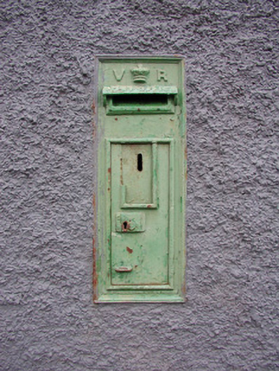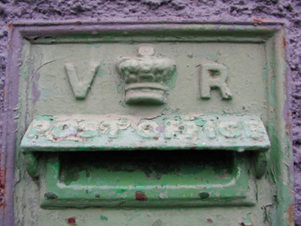 Cast-iron post box, erected c.1890, with VR royal cipher and crown motif. Maker’s mark ‘W.T. Allen & Co. London’ to base. Set within roughcast rendered wall.
