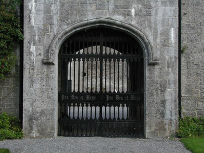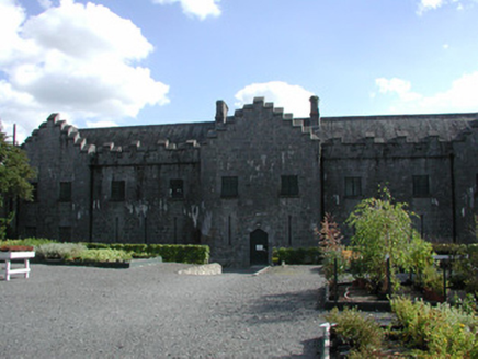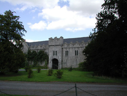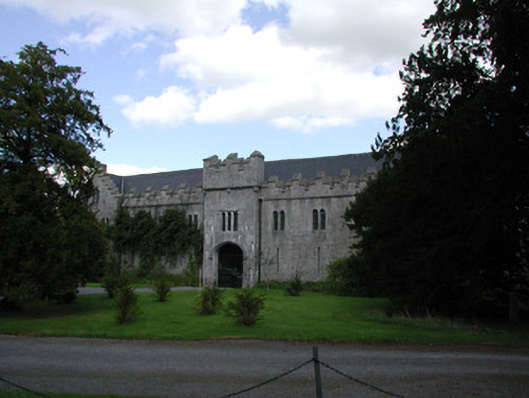 Detached U-plan former stables, built in 1850, to designs by Mary Rosse. Situated within the Birr Castle demesne, it comprise three ranges of buildings surrounding an inner courtyard. Pitched slate roofs with terracotta ridge tiles and cut stone chimneystacks. Stone finial to gable-fronted entrance bay within northern range and crow-stepped stone coping to parapet of southern elevation, crenellated parapet to outer elevations of western and northern ranges. Ashlar limestone walls with tooled stone quoins with corner turret to south-west corner of western range and projecting breakfront to outer elevation of northern range. Variety of window openings including square-headed openings with tooled stone sills and replacement casement windows, round-headed openings with tooled stone sills and replacement timber windows flanking central entrance. Paired pointed-arched openings with replacement timber windows to outer wall of western range, and tripartite window opening with replacement timber windows and stone hoodmoulding surmounting carriage arch opening to centre of western range. Blind loops to outer elevation of northern range. Balistraria to gable-fronted entrance bay. Segmental-headed former carriage arch openings to all elevations of inner courtyard with replacement timber and glazed windows. Square-headed door openings with tooled stone surrounds, overlight and timber battened doors. Central carriage arch to western range with Tudor arched opening and timber and cast-iron gates giving access into demesne.
