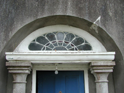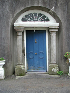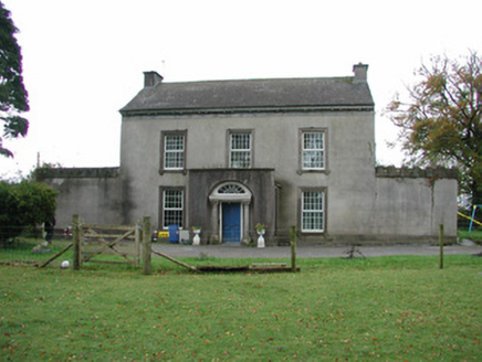 Detached three-bay two-storey with attic house, built c.1800, with return to rear, entrance porch and flanking castellated bays, c.1840. Single-storey extensions to rear elevation. Pitched tiled roof with rendered chimneystacks and bracketed limestone eaves course with decorative applied roundels. Ruled and lined rendered walls, castellated to flanking bays. Square-headed window openings with replacement uPVC windows, stucco architrave surrounds and limestone sills. Round-headed door opening to entrance porch with petal fanlight, granite columns and timber panelled door. Original entrance gates survive disused to west of house and consist of wrought-iron gates flanked by limestone piers with fluted cornice, flanked by quadrant walls with limestone castellation terminating in limestone piers.