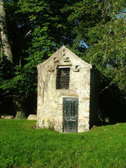 Freestanding single-bay dovecote, built c.1800. Pitched slate roof with sprocketed eaves. Roughcast render to random coursed stone walls. Window opening with stone lintel. Square-headed door opening with replacement timber door. Stone perches and pigeon holes.