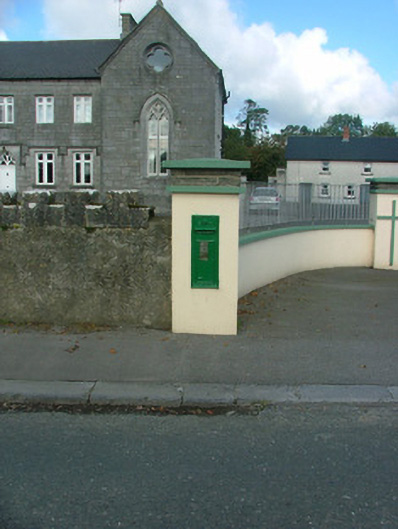 Wall-mounted cast-iron post box, erected c.1915, with GR insignia and crown motif. Maker’s mark ‘W.T. Allen & Co. London’ to base. Set in smooth rendered gate pier of Lehinch Monastery.