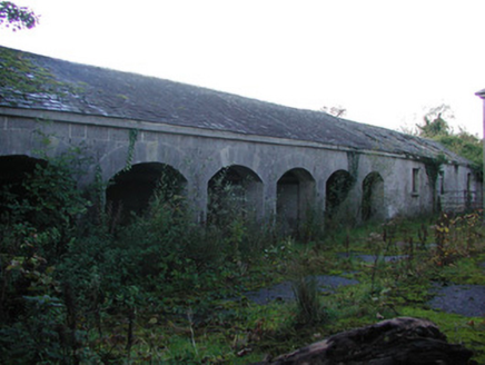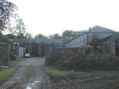 Ranges of multiple-bay single- and two-storey outbuildings, built in 1833, and arranged around two courtyards with modern concrete additions. Set within grounds of Durrow Demesne. Now mostly disused. Hipped slate roofs with terracotta ridge tiles, ashlar chimneystacks and cast-iron rainwater goods. Tooled ashlar limestone walls. Timber sash windows to upper storey with tooled limestone sills. Segmental-headed door openings. Circular opening with date plaque to south-west elevation. Squared limestone turbine house to centre of north-west courtyard. Yellow brick workers' accommodation to north-west of site. Walled garden and moat to rear of site, also associated with Durrow Demesne.