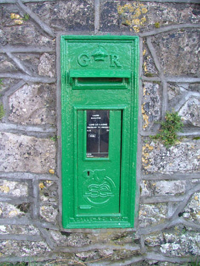 Wall-mounted cast-iron post box, c.1915, with GR royal cipher with crown motif to top and SE emblem to base. Mounted in random coursed limestone wall to side of road west of Saint Columba's Catholic Church. Maker’s mark 'W.T. Allen & Co. London' to base.