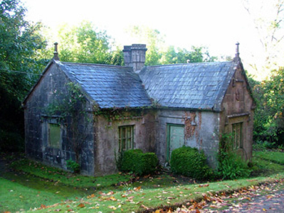 Detached T-plan three-bay single-storey gate lodge, built c.1840 with return to rear. Not in use. Set within grounds of Durrow Demesne. Pitched slate roof with terracotta ridge tiles, ashlar chimneystacks, coping and cast-iron rainwater goods. Triple-light timber windows with limestone hoodmoulding. Square-headed door opening in north projection with timber panelled door and limestone hoodmoulding. Plaque with crown and fleur-de-lis on north projection gable wall and hoodmoulding. Yellow brick pitched roofed return to rear. Palladian style wrought-iron gateway to east, set on ashlar limestone plinth with carriage arch and pedestrian gates to centre.