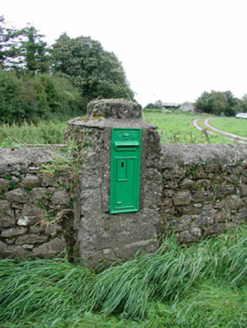 Wall-mounted cast-iron post box, c.1890, with VR royal cipher and crown motif. Maker’s mark ‘W.T. Allen & Co. London’ to base. Mounted on a rendered gate pier to side of road.