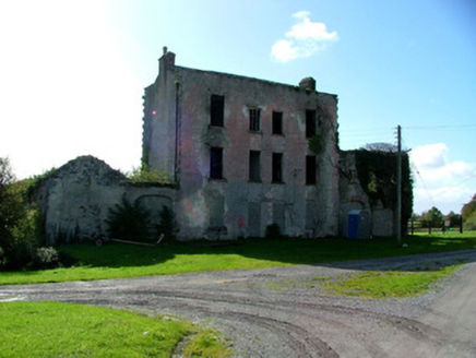 Pair of two-bay three-storey semi-detached houses, built c.1830, with return to rear and carriage arches set in flanking walls. Now derelict. Set within its own grounds. Pitched slate roof hidden by parapet with red brick chimneystacks and some cast-iron rainwater goods. Roughcast render to walls with exposed stone in places. Blocked and open window openings with stone sills. One surviving timber sash window. Blocked square-headed door openings. Blocked red brick segmental-headed carriage arches flanking building. Side and rear site bounded by random coursed limestone wall.