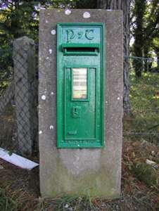 This post box is still in use today and is a notable feature on the roadside. The Celtic P & T script adds an artistic significance. The London firm of founders, W.T. Allen & Co., was in operation from 1881-1955.