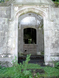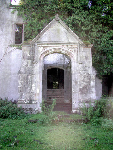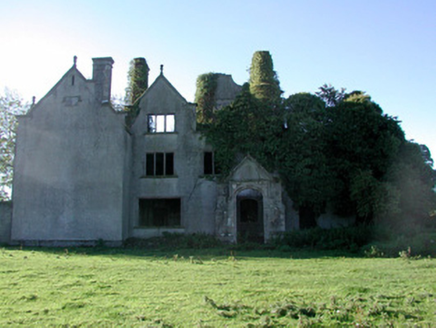 Detached five-bay two-storey country house with dormer attic, dated 1898, on an L-shaped plan centred on single-bay single-storey gabled projecting open porch to ground floor; single-bay two-storey gabled projecting end bay. Occupied, 1901; 1911. Burnt, 1923. Now in ruins. Roofs now missing with ivy-covered limestone ashlar chimney stacks having ogee-detailed stringcourses below ogee-detailed cornice capping. Part ivy-covered rendered, ruled and lined mass concrete walls on overgrown plinth with finial-topped ogee-detailed cut-limestone coping to gables. Tudor-headed door opening (porch) with three cut-limestone steps, and cut-limestone block-and-start surround having moulded reveals with hood moulding. Tudor-headed door opening into country house with cut-limestone step threshold, and cut-limestone block-and-start surround having moulded reveals centred on keystone. Square-headed window openings in multipartite arrangement with lichen-spotted cut-limestone sills, cut-limestone mullions, and cut-limestone block-and-start surrounds having bull nose-detailed reveals with no fittings surviving. Interior in ruins. Set in unkempt grounds.