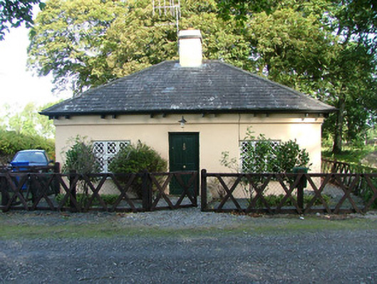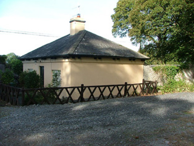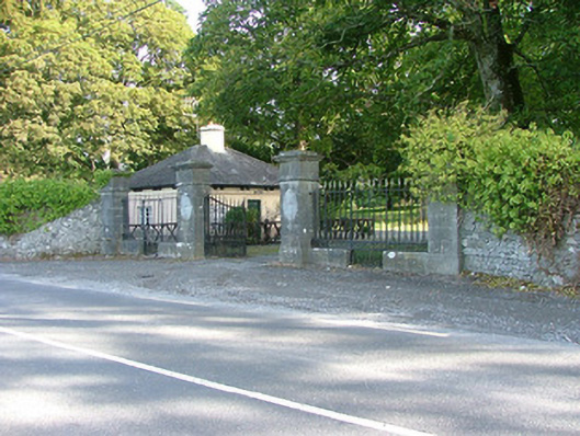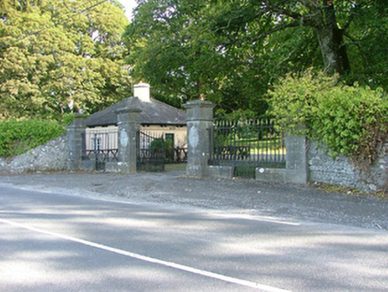 Detached three-bay single-storey gate lodge, c.1810. Hipped slate roof with paired timber modillions at eave course. Rendered walls with square-headed door and window openings with timber casement lattice windows and stone sills. Set behind square-headed ashlar limestone gate piers with fluted capitals, plinth walls with spear-headed cast-iron railings and gates.
