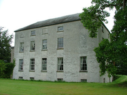 Detached five-bay three-storey over basement country house, built c.1730, with two-storey addition to north. Set within its own grounds. Hipped slate roof with rendered chimneystacks and some cast-iron rainwater goods. Roughcast rendered walls with limestone eaves course. Square-headed window openings with timber sash windows and tooled limestone sills. Tooled limestone window surrounds concealed beneath render. Round-headed door opening with tooled limestone Gibbsian surround, spider web fanlight and timber and glazed door. Door accessed up four limestone steps. Yard to north of house with L-plan range of two-storey outbuildings and stables. Also to yard are the remains of Corolanty Castle comprising the west walls of the structure with two flanking corner towers. Walled gardens to northwest of house. Derelict gate lodge to south of house. Site accessed through wrought-iron gates flanked by ashlar limestone piers.