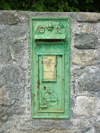 Wall-mounted cast-iron post box, c.1915, with GR royal cipher and crown motif. The door incorporates a later SE (Saorstat Éireann) emblem. Located at Mountheaton Crossroads in a wall adjacent to southern entrance gates to Mount Saint Joseph's Abbey.