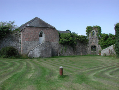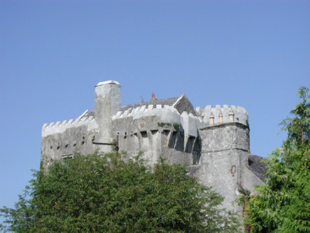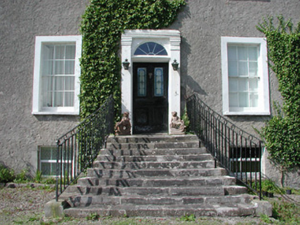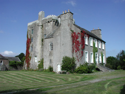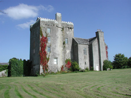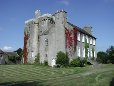 Detached T-plan five-bay two-storey over basement county house, built c.1700, abutting renovated five-storey rectangular-plan tower house to west. House having pitched slate roof with terracotta ridge tiles and roughcast rendered chimneystacks with yellow terracotta pots. Roughcast rendered walls. Timber sash windows to façade with stucco surrounds. Round-headed timber sash window to south elevation of return. Gothic style timber fanlight to blocked up door opening on northern elevation of return with intersecting glazing bars. Square-headed door opening to façade having pilastered stucco surround, timber panelled door with stained glass panes door and spoked fanlight. Triangular-headed door opening to south gable of house with round-headed metal door. Rectangular-plan tower house with circular stair turret at its north-east angle. Pitched slate roof with castellated parapet and bartizans to south-east and north-west corners and stone chimneystack over north and elevations. Roughcast rendered walls with loop openings and corbels to north elevation carrying oversailing garderobes and mural passages. Machicoulations to east formerly defended entrance, now masked by house. Castellated porch to west of tower-house. Square-headed window openings inserted to tower house. Yard to west with ranges of stone outbuildings to west having pitched slate roofs. Yard accessed from north through wrought-iron gates. Wall to south of tower. Stone and brick outbuilding to south half-hipped slate roof and external stairs with date plaque reading ‘JTS 1883’. Adjacent stone wall with round-headed opening with tooled stone surround and wrought-iron gate, accessing yard, surmounted by bellcote. Walled garden to south west of house. Ashlar gate piers with carved caps and sweeping walls to road.