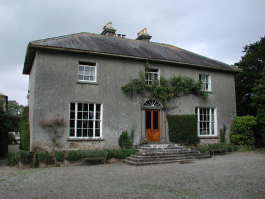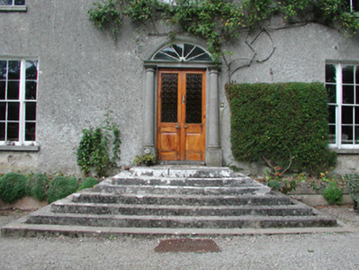 Detached three-bay two-storey over basement farmhouse, built c.1810, with full-height return and single-storey lean-to extension to rear. Hipped slate roof with open eaves, cast-iron profiled gutters, roughcast rendered chimneystacks with terracotta chimneypots. Roughcast rendered walls with cast-iron water pump to rear elevation and weather slating to northern side elevation. Timber sash windows with tooled stone sills. Wyatt windows to ground floor level of façade. Timber casement windows to basement with cast-iron bars. Segmental-headed doorcase with timber spoked fanlight, stone Doric columns and replacement glazed timber door accessed via tooled stone steps. Central cobbled yard to rear with two two-storey stone outbuildings having pitched slate roofs. Tooled stone block-and-start door surrounds to south outbuilding and integral carriage arches and battened doors to north outbuilding. Segmental-headed carriage arch entrance to road within random coursed walls having tooled stone voussoirs and adjacent stone block-and-start door surround. Incised date of 1897 to inner side of door surround. Upper yard with derelict stone outbuildings and former workers’ accommodation with brick openings and carriage arches. Walled garden to north retaining notable species of fruit trees. Lower yard to south of central yard with two two-storey outbuildings, both bearing date plaques reading ‘Erected by H.B. Kenny August 1904’. Formal linear planting of beech trees to north of house. Gateway to road with inner and outer vermiculated rendered piers, with ball finials, sweeping roughcast rendered walls and iron gates.